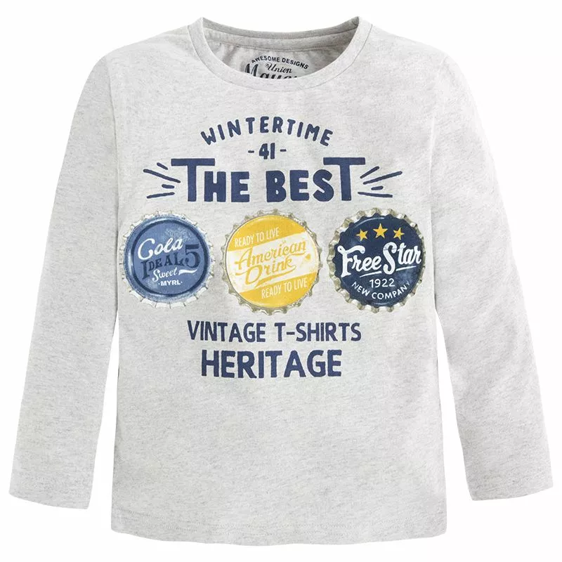 Chlapecké triko s dlouhým rukávem v šedé barvě s nápaditým potiskem víček od nápojů