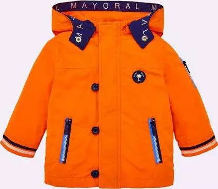 Dětská větrovka v neonově oranžové barvě z velice příjemného měkkého materiálu. Bunda na zip s odepínací kapucí a bavlněnou podšívkou v originálním designu předního výrobce dětského oblečení španělské firmy Mayoral.