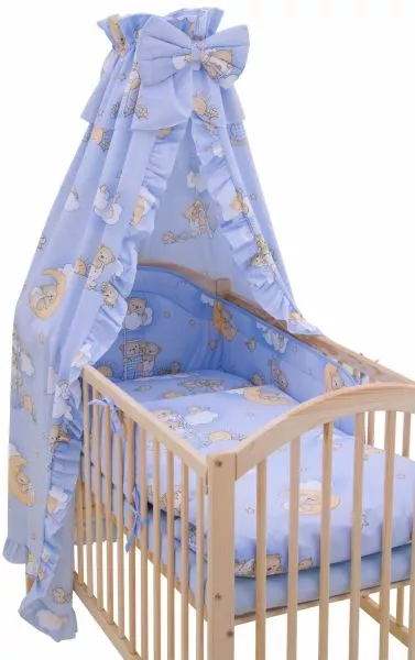 Souprava obsahuje: povlečení na peřinku 90 x 120 cm, povlečení na polštář 60 x 40 cm, ochranný límec okolo 2/3 postýlky a nebesa. Tato souprava je vhodná i do postýlek 140 x 70cm.