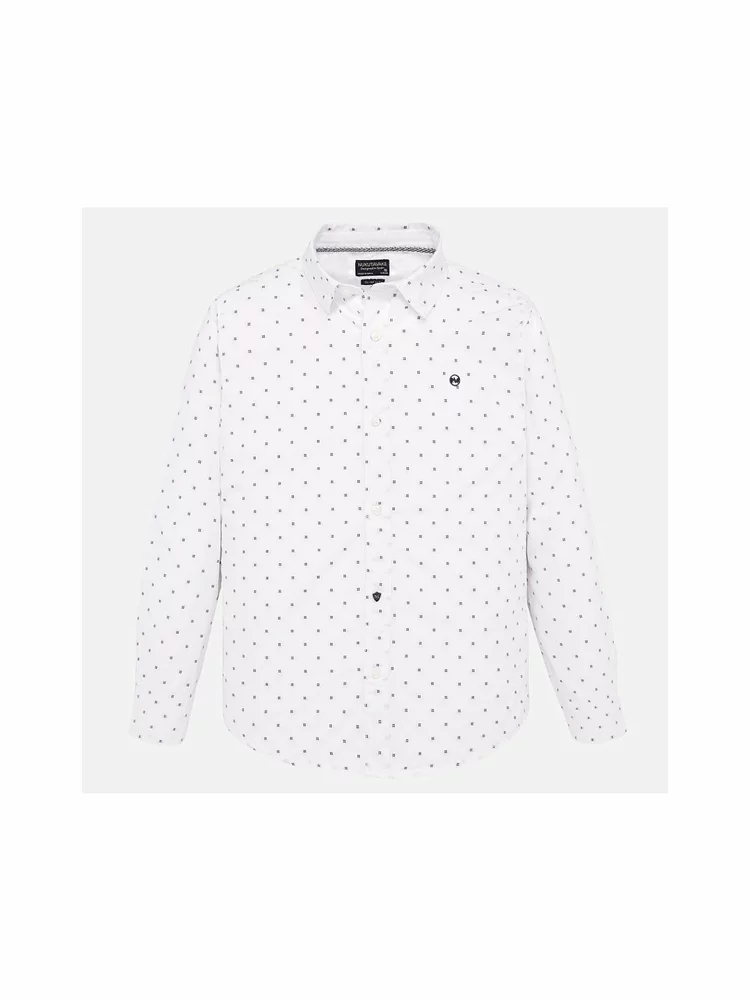 Bílá bavlněná košile s dlouhým rukávem pro kluky od výrobce dětského oblečení španělské firmy Mayoral. Košile je perfektně vypracována do každého detailu. Vetkaný jemný vzoreček dodává košili originální vzhled.