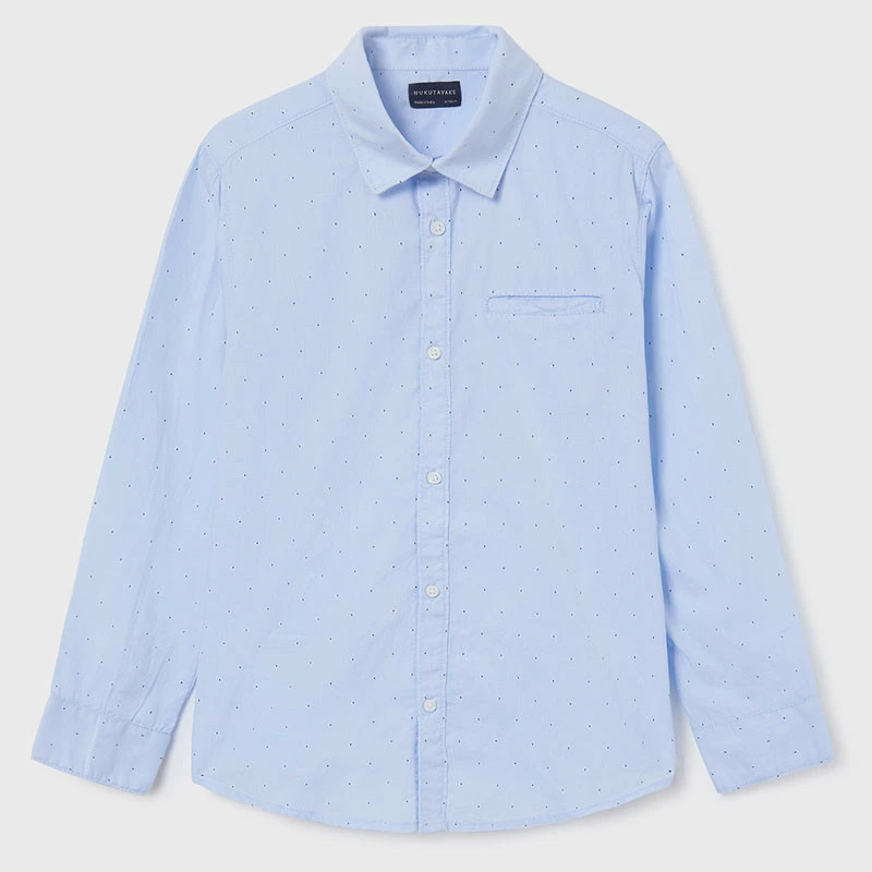 Modrá bavlněná košile s dlouhým rukávem pro kluky od výrobce dětského oblečení španělské firmy Mayoral.
