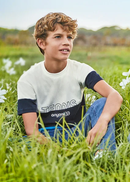 Chlapecké triko ve sportovním stylu s nápisem TENNIS v modrobílých barvách od značky Mayoral