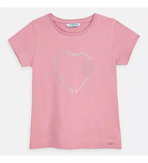 Dívčí letní triko s drobnými stříbrnými nápisy a srdíčkem ze štrasových kamínků od módní značky Mayoral.