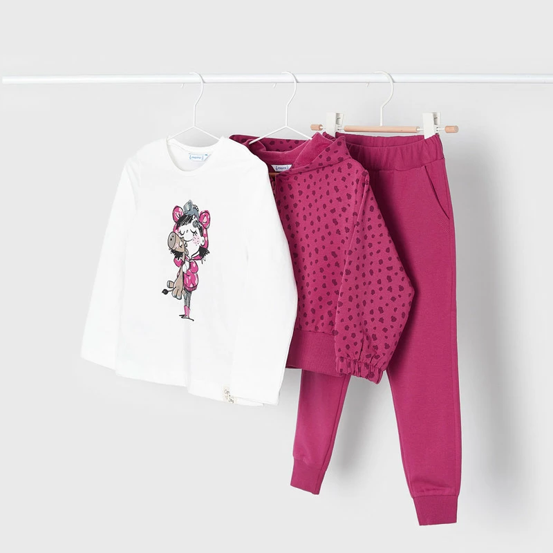 Mikina s kapucí, růžové tepláčky a bílé tričko s holčičkou tvoří dokonalé oblečení pro každý všední den. Městská teplákovka pro holčičky od módní značky Mayoral.