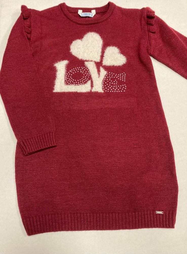 Teplé pletené šatičky od známé značky Mayoral ve vínové barvě s nápisem LOVE, nápis ozdoben třpytivými stříbrnými kamínky.
