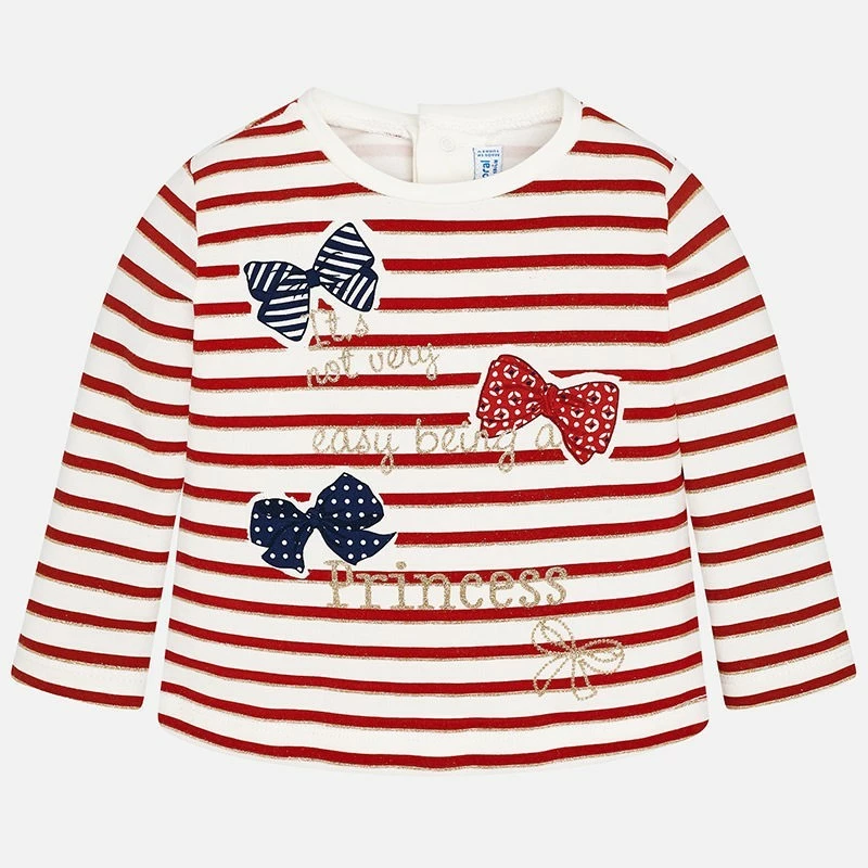 Dívčí triko s dlouhým rukávem, červenozlatými proužky s potiskem mašliček.