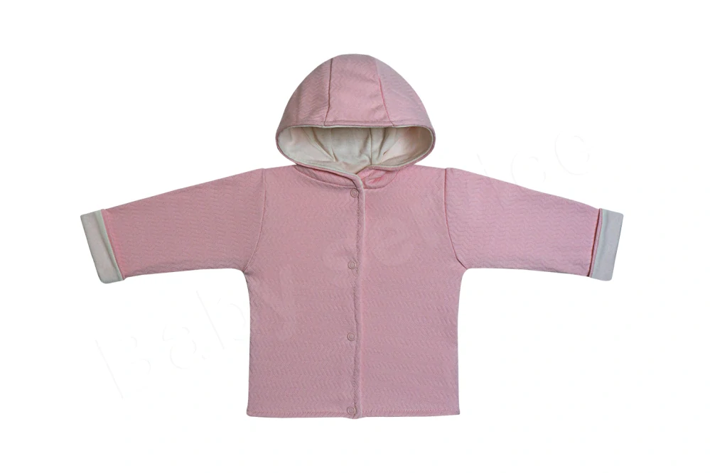 Dvojitý kabátek s kapucí v růžové barvě, podšitý úpletovou bavlnou ve smetanové barvě. Vrchní materiál je strukturovaný,vnitřní strana je hladká, jemná na dotek.