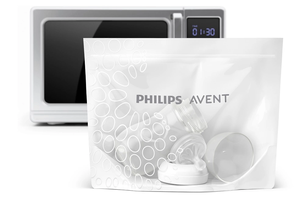 Parní sterilizační sáčky Philips Avent do mikrovlnné trouby jsou rychlým, snadným a účinným způsobem, jak zajistit, že budete vždy mít sterilní kojenecké lahve a výrobky, ať jste kdekoli. S každým sáčkem lze lahve sterilizovat v mikrovlnné troubě za pouhých 90 sekund.